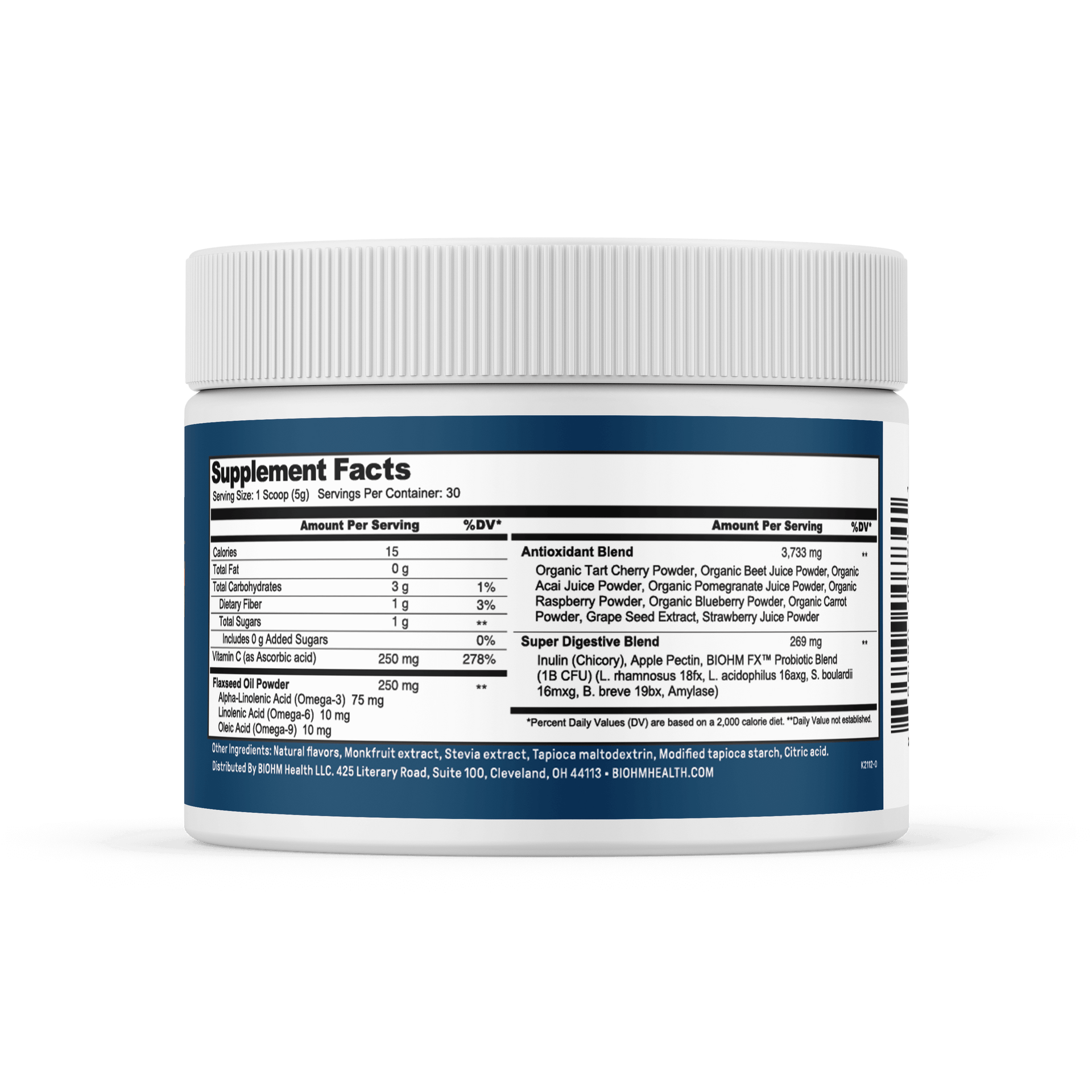 Super Digestive Blend: (Inulin (Chicory), Apple Pectin, BIOHM FX Probiotic Blend (1B CFU) (L. rhamnosus 18fx, L. acidophilus 16 axg, S boulardii 16 mxg, B. breve 19bx, Amylase))